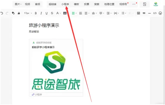 2. 在文章编辑页,点击嵌入“小程序”